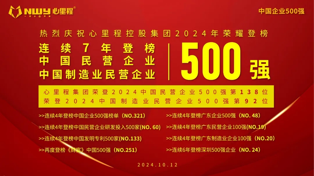 心里程集團榮登2024廣東省民營企業(yè)100強第17位,制造業(yè)民營企業(yè)100強第9位