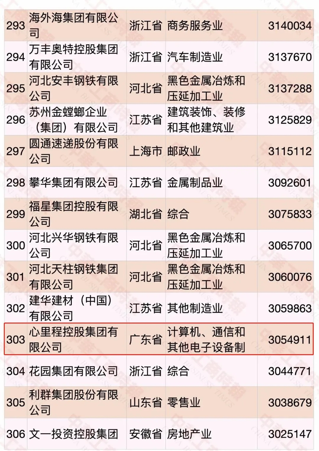 心里程集團(tuán)榮登2020中國(guó)民營(yíng)企業(yè)500強(qiáng)榜單第303位