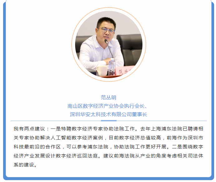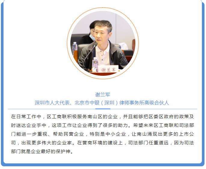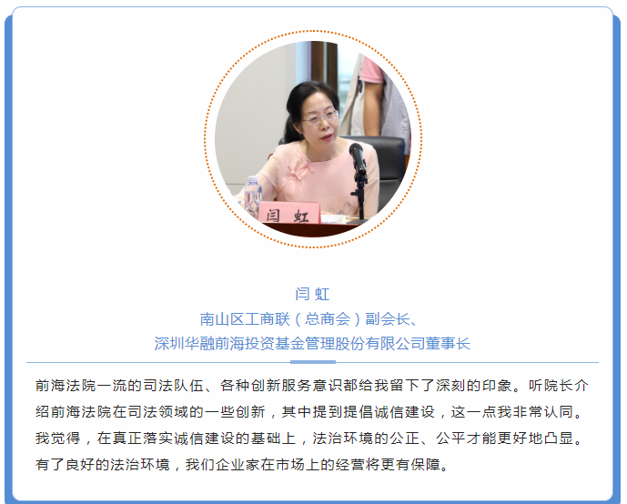 深圳前海合作區(qū)人民法院黨組書記、院長聞長智介紹了前海法院的工作情況。聞院長表示,大力支持和促進(jìn)民營企業(yè)發(fā)展壯大,是人民法院責(zé)無旁貸的職責(zé)使命。前海法院將充分發(fā)揮審判職能作用,保護(hù)民營企業(yè)家合法權(quán)益,進(jìn)一步暢通司法救濟(jì)渠道,健全完善多元矛盾糾紛化解機(jī)制,為民營企業(yè)提供更加優(yōu)質(zhì)、高效、便捷的訴訟服務(wù),讓民營企業(yè)獲得更加安全穩(wěn)定的發(fā)展。聞院長提出,衡量國際經(jīng)濟(jì)司法公信力一個(gè)最顯著的標(biāo)志是國際、國內(nèi)當(dāng)事人愿意到前海法院來打官司,來解決他們的糾紛,這是公信力的重要表現(xiàn),前海法院正在朝著這一目標(biāo)努力。