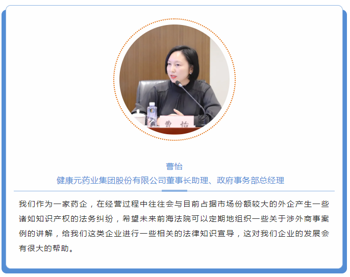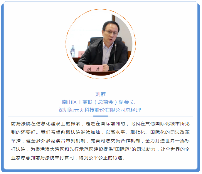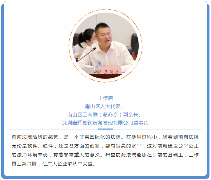 11月3日,為進(jìn)一步優(yōu)化市場化法治化營商環(huán)境,構(gòu)建“親”“清”政商關(guān)系,助力民營企業(yè)走向更廣闊舞臺(tái),由南山區(qū)工商聯(lián)專職副主席肖曉青帶隊(duì),30多名市、區(qū)人大代表,市、區(qū)政協(xié)委員,民營企業(yè)家代表走進(jìn)深圳前海合作區(qū)人民法院(以下簡稱“前海法院”)。此次活動(dòng)是南山區(qū)工商聯(lián)組織的第二屆“深圳企業(yè)家日”系列主題活動(dòng)之一。心里程控股集團(tuán)董事長彭國遠(yuǎn)受邀參加活動(dòng)。