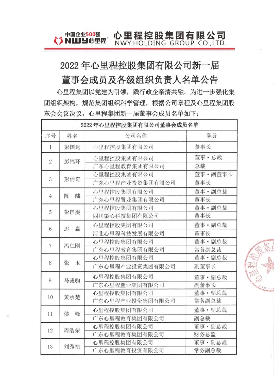 為進(jìn)一步強(qiáng)化集團(tuán)組織架構(gòu),規(guī)范集團(tuán)組織科學(xué)管理,日前,心里程集團(tuán)召開股東會(huì)議,并根據(jù)公司章程及會(huì)議討論研究,決定了新一屆董事會(huì)成員。3月28日,心里程集團(tuán)正式對(duì)外公布新一屆董事會(huì)成員和各級(jí)組織負(fù)責(zé)人。新一屆董事會(huì)成員由彭國遠(yuǎn)、彭錦環(huán)、彭俏奇、陳陸、彭國委、遲贏、馮仁剛、張玉、馬駿駒、黃承楚、侯峰、周浩榮、劉秀禎十三位成員組成,彭國遠(yuǎn)連任集團(tuán)董事長(zhǎng)。(人員名單如下)