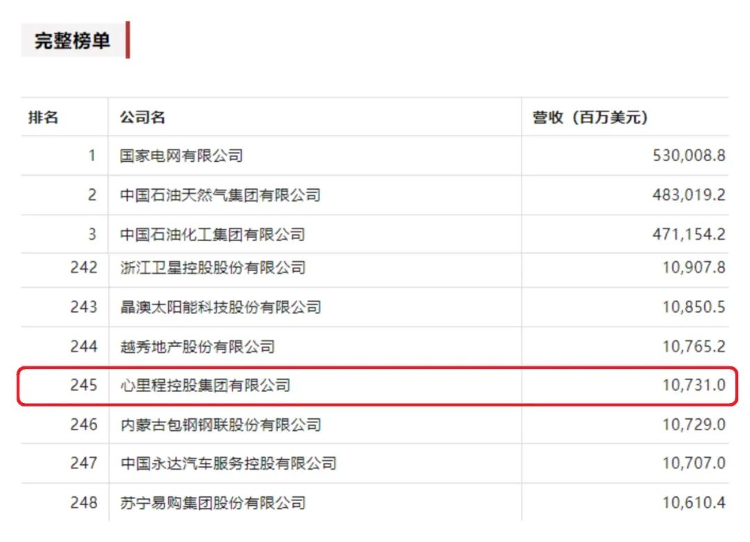 7月25日,財(cái)富Plus APP發(fā)布了2023年《財(cái)富》中國(guó)500強(qiáng)排行榜。心里程集團(tuán)以10731百萬(wàn)美元營(yíng)收榮登榜單第245位。