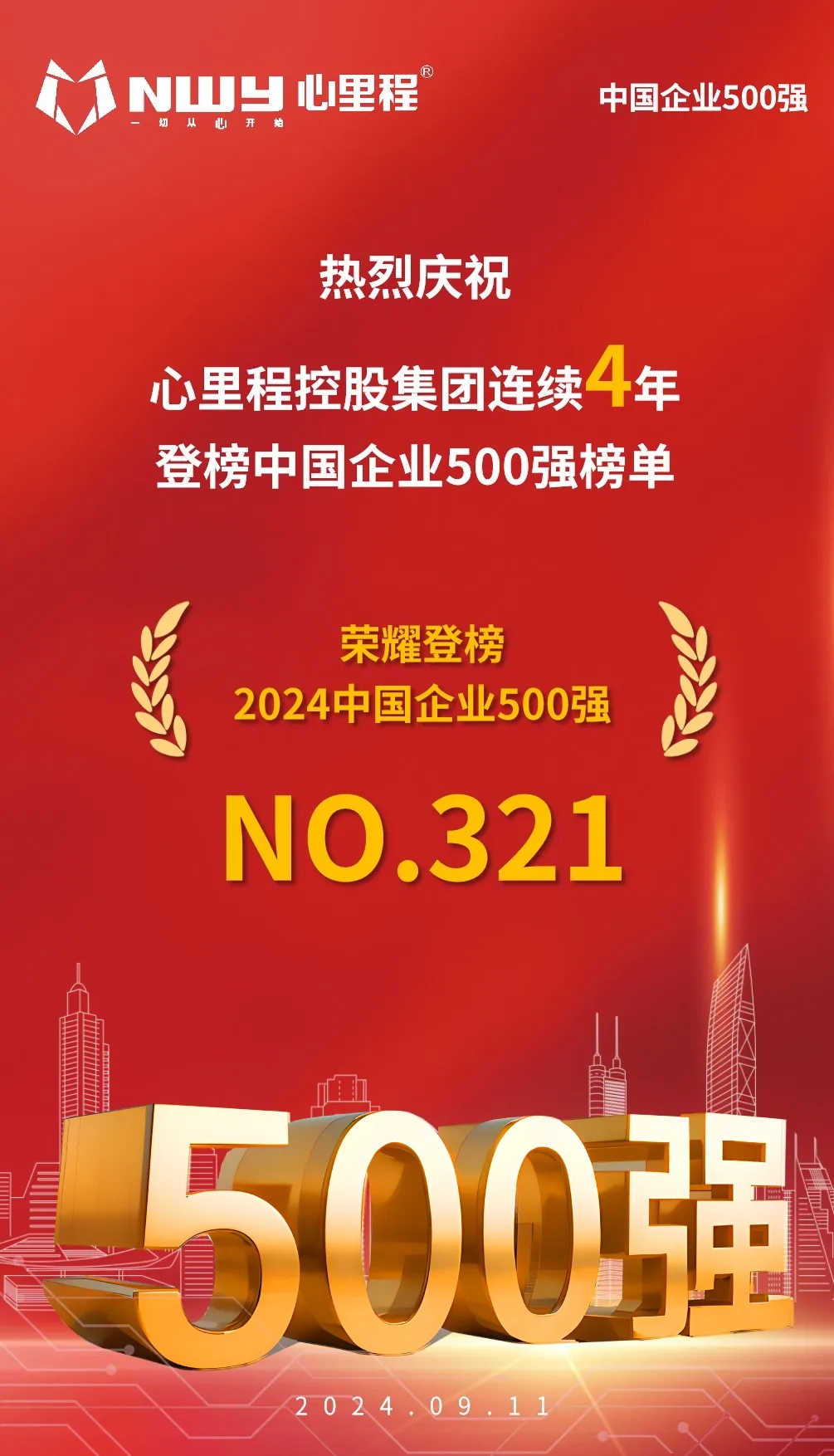 9月11日,在2024中國(guó)500強(qiáng)企業(yè)高峰論壇上,中國(guó)企業(yè)聯(lián)合會(huì)、中國(guó)企業(yè)家協(xié)會(huì)連續(xù)第23次向社會(huì)發(fā)布了“中國(guó)企業(yè)500強(qiáng)”榜單。心里程集團(tuán)在全國(guó)各級(jí)政府及社會(huì)各界的關(guān)心、支持和幫助下,通過(guò)全體心里程人的共同努力與不懈奮斗,以卓越的表現(xiàn)和強(qiáng)勁的增長(zhǎng)動(dòng)力再次榮耀登榜,并從去年的325位上升至第321位。這一成就不僅彰顯了集團(tuán)的綜合實(shí)力與市場(chǎng)地位的顯著提升,更預(yù)示著心里程控股集團(tuán)在未來(lái)發(fā)展中將擁有更加廣闊的空間與無(wú)限可能。