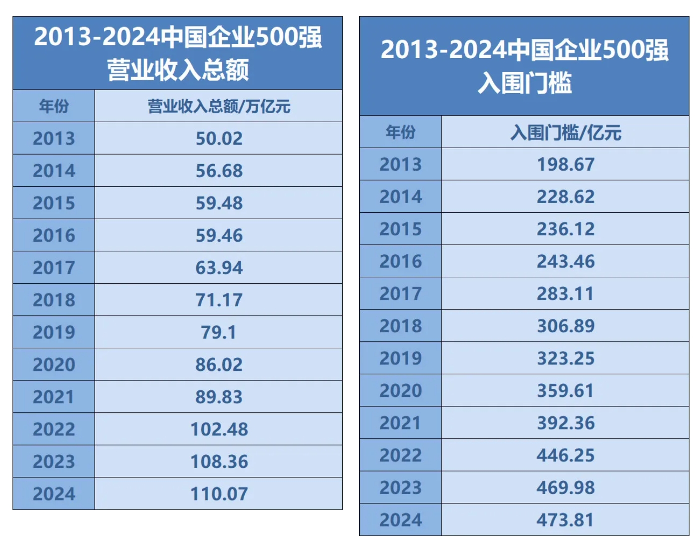 據(jù)悉,2024中國(guó)企業(yè)500強(qiáng)營(yíng)業(yè)收入邁上新臺(tái)階,突破了110萬(wàn)億元大關(guān),達(dá)110.07萬(wàn)億元,較上年相比增長(zhǎng)1.58%。其入圍門檻達(dá)到473.81億元,提升3.83億元,實(shí)現(xiàn)22連升。