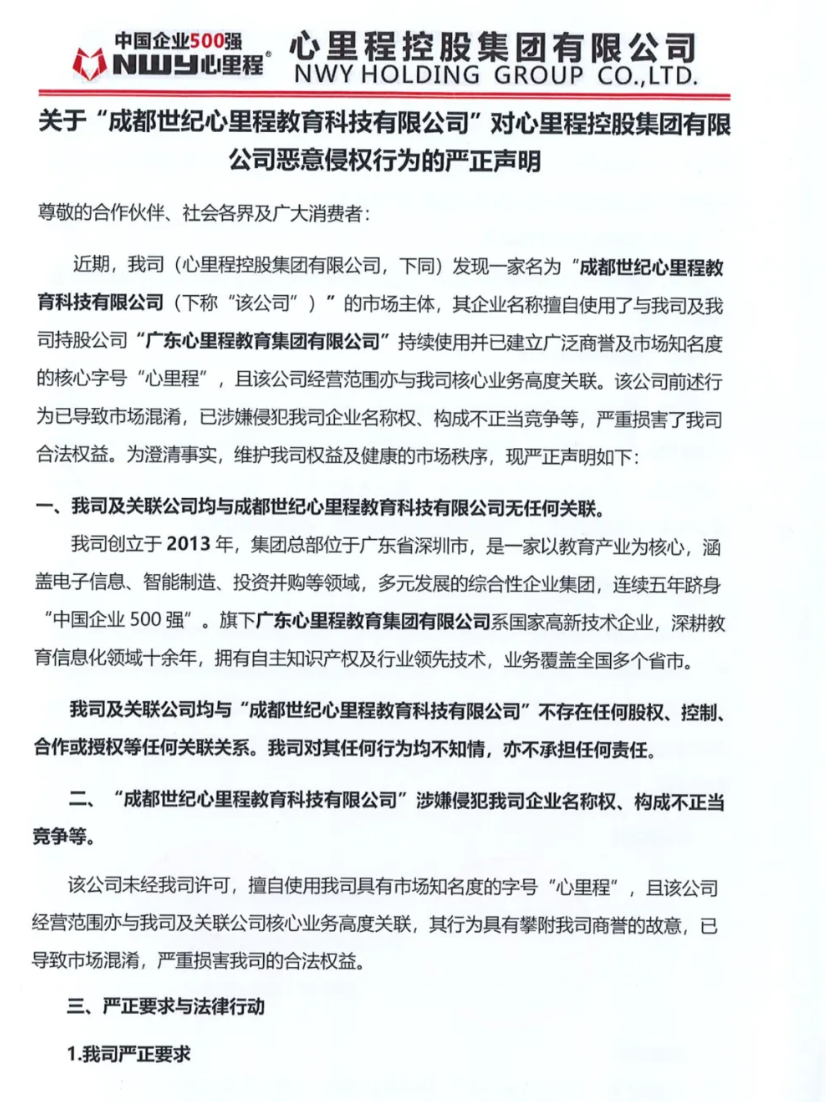 關(guān)于“成都世紀(jì)心里程教育科技有限公司”對(duì)心里程控股集團(tuán)有限公司惡意侵權(quán)行為的嚴(yán)正聲明