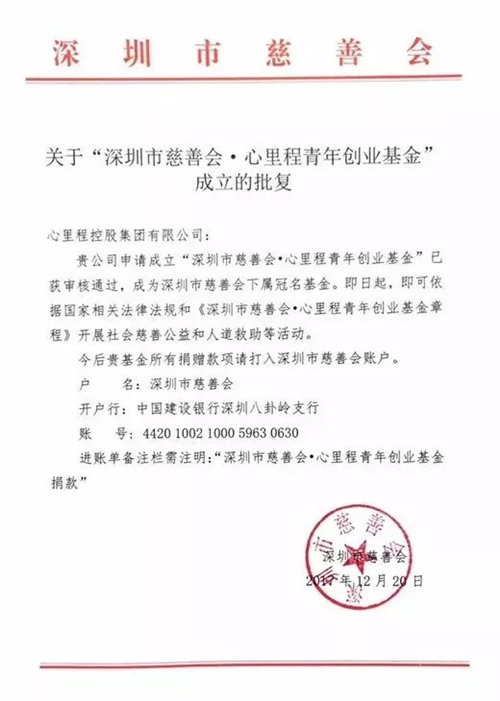 2018新年伊始,心里程控股集團(tuán)接收到了深圳慈善會開具的捐贈發(fā)票及其頒發(fā)的捐贈證書,這是“深圳市慈善會·心里程青年創(chuàng)業(yè)基金”成立以來,心里程集團(tuán)向深圳慈善會捐贈的首筆款項。