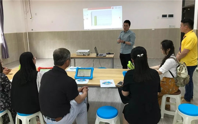 心里程教育集團(tuán)的工程師們現(xiàn)場(chǎng)為校長(zhǎng)們演示“互聯(lián)e課堂”平板電腦的使用方法,并講解特色功能。