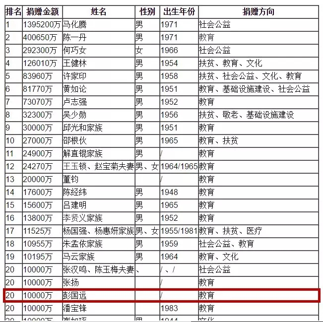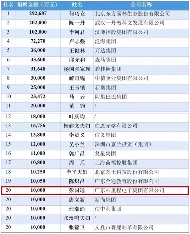 榜單上顯示,心里程控股集團(tuán)董事長(zhǎng)彭國(guó)遠(yuǎn)以2000萬元的現(xiàn)金捐贈(zèng)榮登慈善榜第75位。