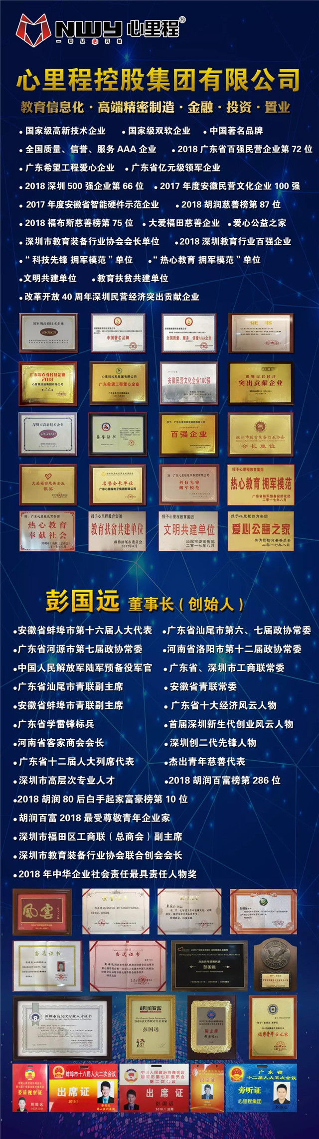 自創(chuàng)業(yè)以來,彭國遠(yuǎn)董事長一直秉承“一切從心開始”的經(jīng)營理念,以務(wù)實的作風(fēng)及創(chuàng)新的精神,不斷進(jìn)取,拼博向上,創(chuàng)造百億集團(tuán)心里程。目前心里程集團(tuán)已擁有4個省級集團(tuán)子公司,數(shù)十家控股參股公司,并在全國多個省市建立了區(qū)域總部經(jīng)濟(jì)及產(chǎn)業(yè)園,產(chǎn)業(yè)涉及教育信息化、高端精密制造、金融、投資、置業(yè)等領(lǐng)域,并榮獲“國家級高新技術(shù)企業(yè)”、“國家級雙軟企業(yè)”、“2018年廣東省百強(qiáng)民營企業(yè)”、“2018深圳500強(qiáng)企業(yè)第66位”等多項榮譽(yù)。
