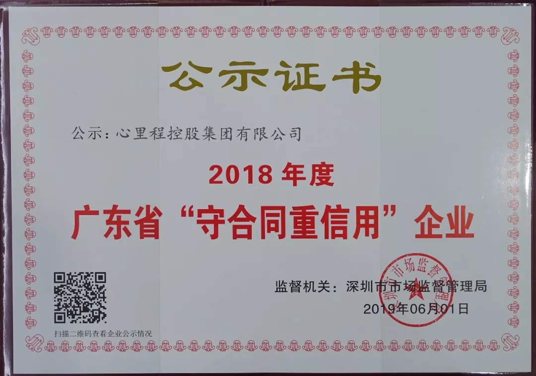近日,廣東省市場監(jiān)督管理局對“2018年度守合同重信用企業(yè)”進(jìn)行了公示,心里程控股集團(tuán)以自身良好的信用體系及誠實(shí)守信的企業(yè)形象,榮獲“2018年度廣東省守合同重信用企業(yè)”稱號。