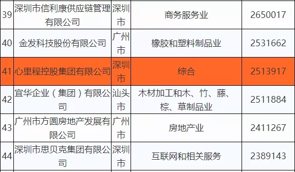 | 41 | 心里程控股集團(tuán)有限公司 | 深圳市 | 綜合 | 2513917 |