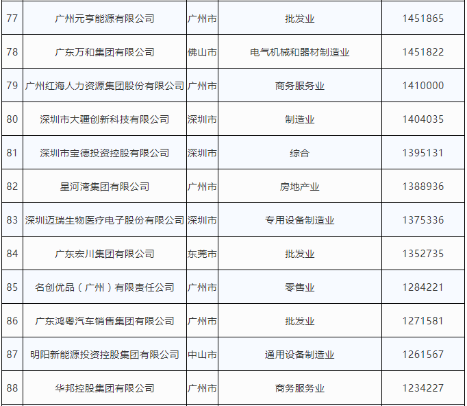 | 43 | 廣州市方圓房地產(chǎn)發(fā)展有限公司 | 廣州市 | 房地產(chǎn)業(yè) | 2411267 |