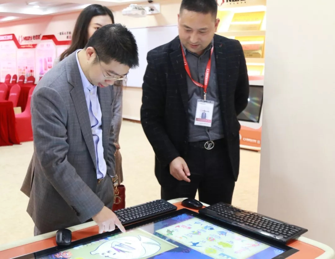 心里程投資集團張玉常務(wù)副總裁(右一)陪同黃仕坤會長一行體驗心里程幼教系列產(chǎn)品
