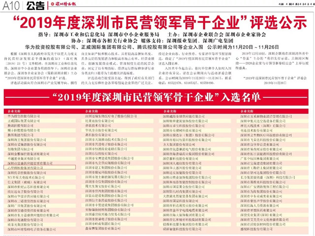 ●11月20日,深圳特區(qū)報A10版公示了“2019年度深圳市民營領(lǐng)軍骨干企業(yè)”入選名單,共100家包括華為投資控股有限公司、正威國際有限公司、騰訊控股有限公司、心里程控股集團(tuán)有限公司等企業(yè)入圍。