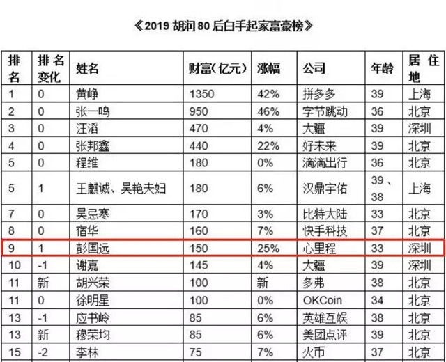 ●10月28日,《2019胡潤80后白手起家富豪榜》重磅發(fā)布,這是胡潤研究院連續(xù)第四次發(fā)布次榜單,財富計算的截止日期為2019年8月15日。彭國遠(yuǎn)董事長以150億元財富躍居榜單第9位。