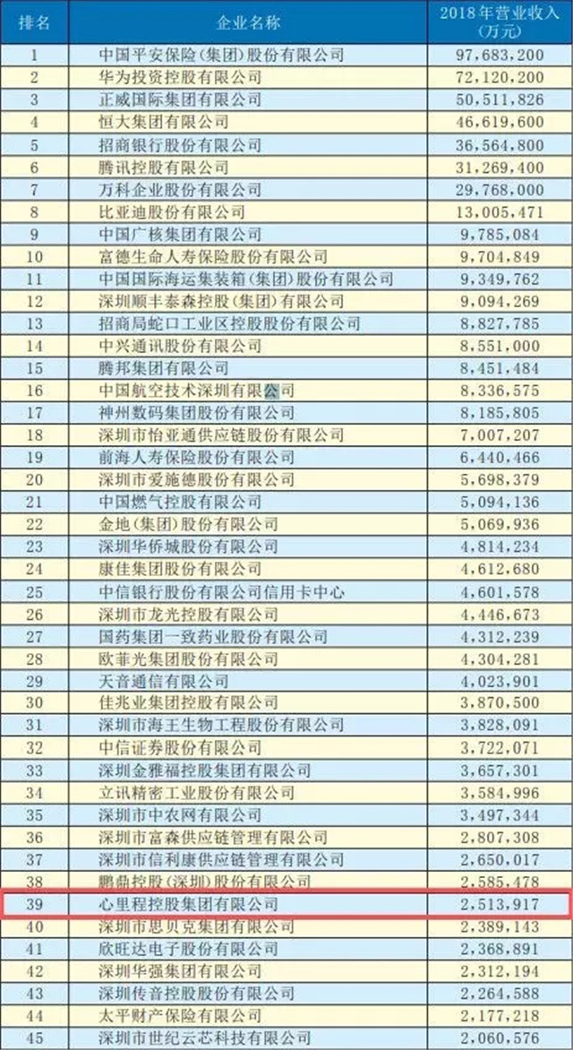 ●由深圳市企業(yè)聯(lián)合會、深圳市企業(yè)家協(xié)會(以下簡稱深圳企聯(lián))編撰的《2019深圳500強(qiáng)企業(yè)發(fā)展報告》即將正式對外發(fā)布?!?019深圳500強(qiáng)企業(yè)發(fā)展報告》中的“2019深圳500強(qiáng)企業(yè)”名單于7月30日在《深圳商報》予以公示,心里程控股集團(tuán)排名第39位,比較2018年前進(jìn)了27名。