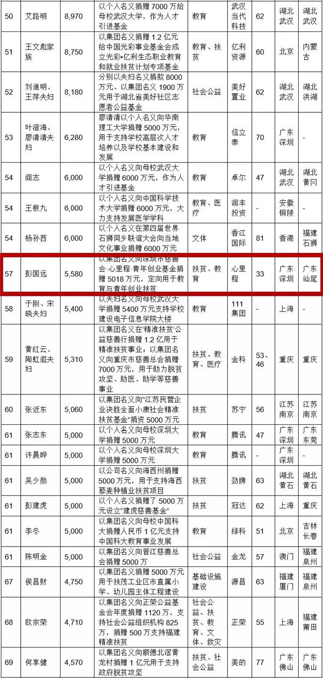 ●5月21日,胡潤研究院發(fā)布了2019胡潤慈善榜,心里程集團(tuán)以5580萬元榮登2019胡潤慈善榜第57位,較去年上升30位。