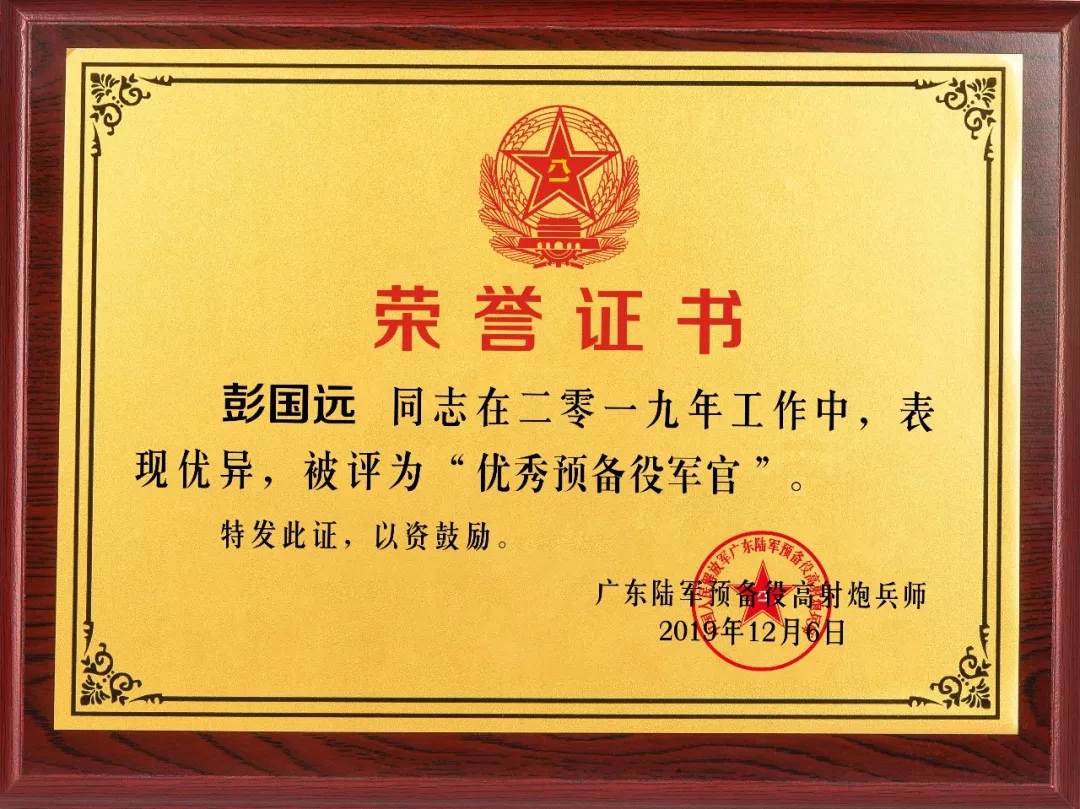 自2016年被編入中國人民解放軍廣東陸軍預(yù)備役以來,彭國遠董事長在發(fā)展事業(yè)的同時,始終以飽滿的政治熱情關(guān)心支持部隊工作,積極為國防建設(shè),為軍民共建工作傾心注力,并多次到部隊開展軍民融合慰問等活動,得到了部隊領(lǐng)導(dǎo)的一致認可。此次已經(jīng)是他第三次獲得了該項殊榮,進一步充分肯定了他在擁軍愛軍、服務(wù)軍隊、國防建設(shè)等方面做出的顯著成績。