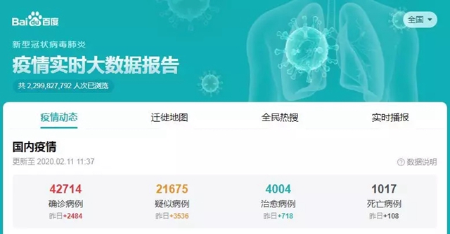 新型冠狀病毒感染肺炎疫情,牽動著全國人民的心。1月27日,習主席作出重要指示,要求各級黨組織和廣大黨員干部團結帶領廣大人民群眾堅決貫徹落實黨中央決策部署,緊緊依靠人民群眾堅決打贏疫情防控阻擊戰(zhàn)。雖然全國人民都已經(jīng)發(fā)動起來,積極參與到疫情防控中。但百度“疫情實時大數(shù)據(jù)報告”上不斷增長的疫情動態(tài)數(shù)據(jù)顯示,當前的疫情防控形勢依然十分嚴峻。截至2020年2月11日11:37,全國確診病例達到42714人,疑似病例21675人,治愈病例4004人,死亡病例1017人。