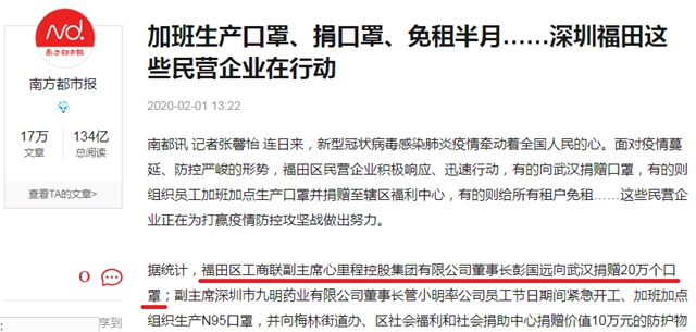 1月底,深圳市福田區(qū)工商聯(lián)副主席、心里程控股集團有限公司董事長彭國遠向武漢捐贈口罩20萬個。