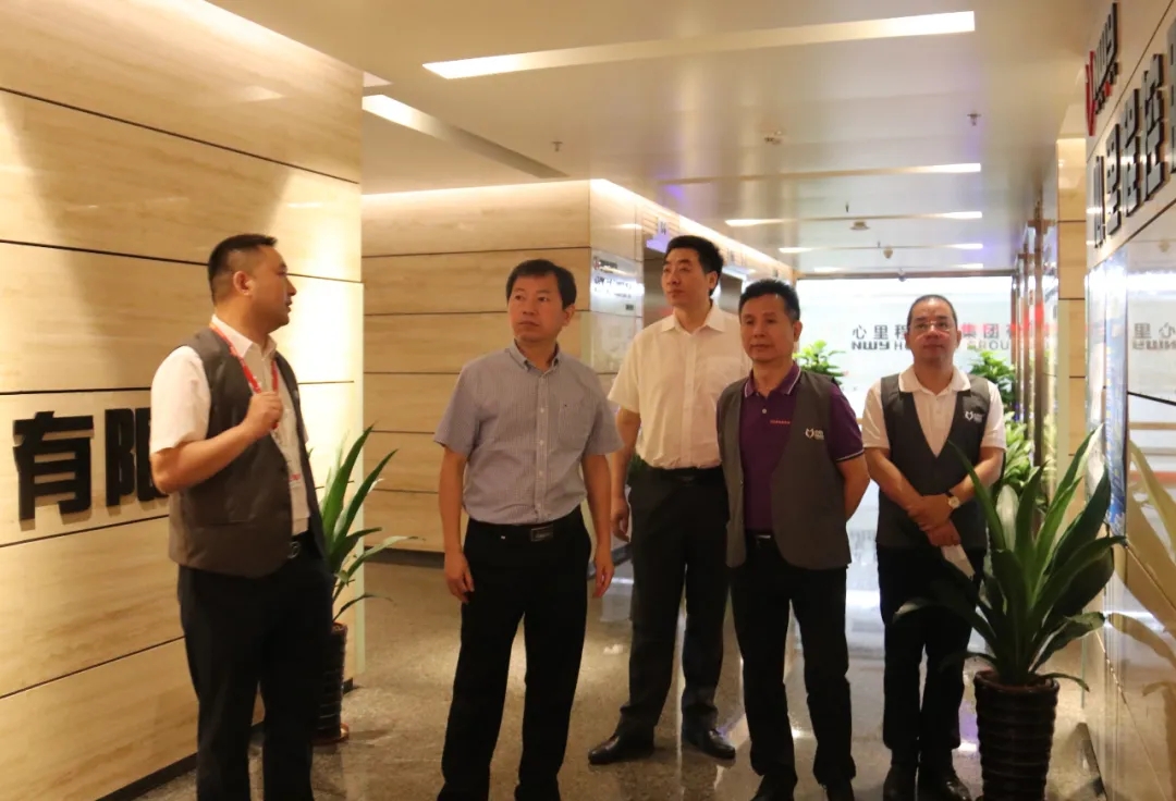 彭俏奇董事長(右三)、陳陸董事長(右一)等領(lǐng)導(dǎo)陪同汪發(fā)進(jìn)書記(左二)一行領(lǐng)導(dǎo)參觀心里程總部